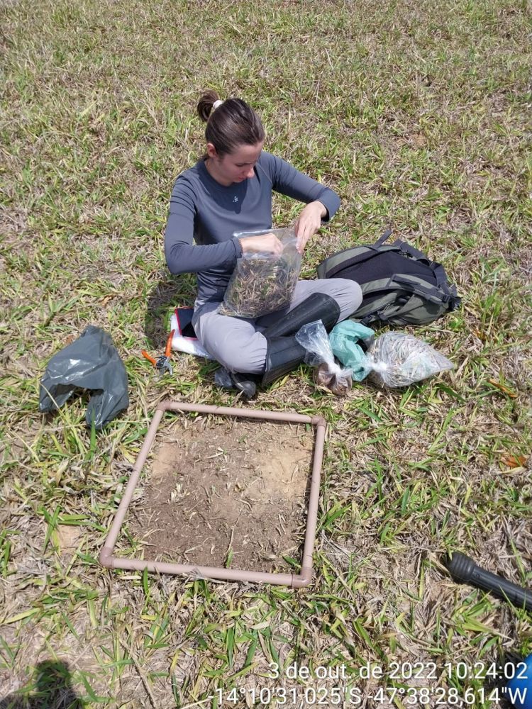 Na propriedade em Alto Paraíso foi feita a amostragem da biomassa acima e abaixo do solo. As amostras foram pesadas, secas e ensacadas. As amostras de solo são coletadas com um trado e em seguida peneiradas para retirada de raízes, que são pesadas e utilizadas para estimar o carbono na biomassa da vegetação abaixo do solo. O solo é enviado para um laboratório para determinação da concentração de carbono, química do solo (pH, cátions e fósforo) e textura de cada área.” Essa amostragem é essencial para estimativas precisas dos estoques de carbono e seguem padrões internacionais de coleta.