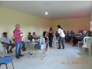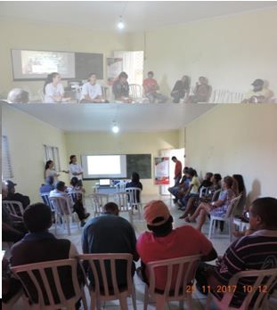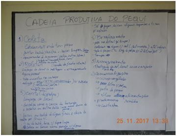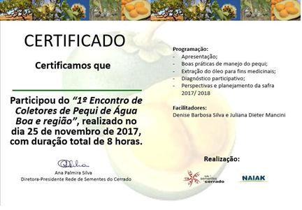 Em 25 de novembro de 2017, as técnicas da RSC, Denise Barbosa Silva e Juliana Dieter Mancini, coordenaram no povoado de Água Boa, distrito de Sítio d'Abadia, GO a realização de uma oficina de sensibilização para os envolvidos na cadeia produtiva do pequi na região. O encontro contou com a participação de 35 pessoas que se envolveram em dinâmicas e relatos de experiência das práticas de manejo do pequi e no estabelecimento das etapas da cadeia produtiva. Representando a NAIAK, o sr. Abdias apresentou as perspectivas e planejamento da empresa para a safra de 2017/2018 e, juntamente com outros funcionários, apontou a diferença entre pequis de boa e má qualidade e demonstrou o processo extração primária de óleo realizado no distrito de Água Boa. Todos receberam certificados de participação e a maioria demonstrou interesse em melhorar a qualidade dos frutos entregues à NAIAK e em participar da próxima fase do trabalho da RSC, que será o acompanhamento e mapeamento da coleta do pequi.