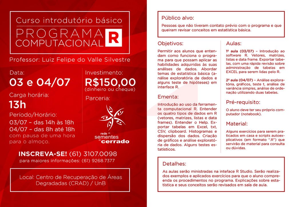 Ementa: Introdução ao uso da ferramenta computacional R. Entender os quatro tipos de dados em R (vetores, matrizes, lista e data frames). Entender o Help. Exportar tabelas em Excel, txt, CSV, clipboard, histogramas e dispersão de dados. Criação de gráficos e análise exploratória de dados. Alguns testes estatísticos.