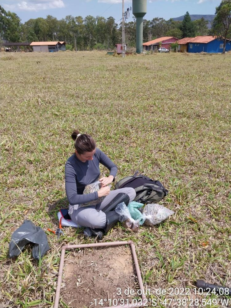 Na propriedade em Alto Paraíso foi feita a amostragem da biomassa acima e abaixo do solo. As amostras foram pesadas, secas e ensacadas. As amostras de solo são coletadas com um trado e em seguida peneiradas para retirada de raízes, que são pesadas e utilizadas para estimar o carbono na biomassa da vegetação abaixo do solo. O solo é enviado para um laboratório para determinação da concentração de carbono, química do solo (pH, cátions e fósforo) e textura de cada área.” Essa amostragem é essencial para estimativas precisas dos estoques de carbono e seguem padrões internacionais de coleta.